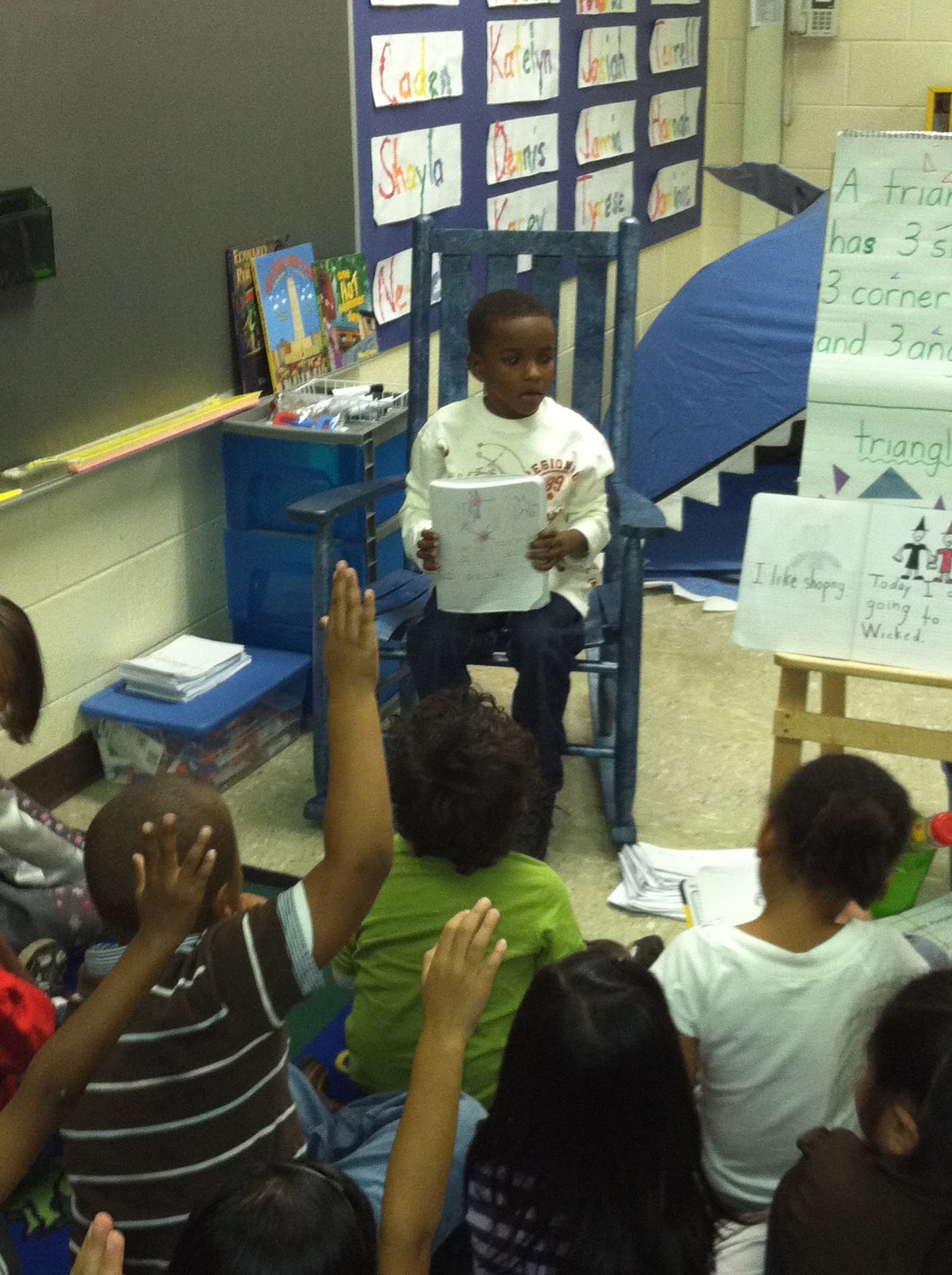 | We get to sit in Mrs. Hendricks' rocking chair. We read our journals to the class and show our illustrations. |